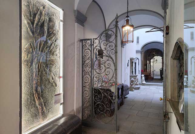 Nell’androne d’ingresso, prima del cancello, è posta a parete una palma fossile risalente a 54 milioni di anni fa, che rappresenta un importante reperto naturalistico.